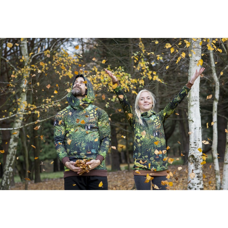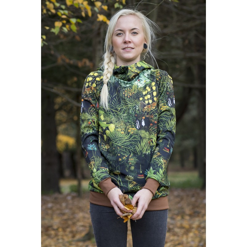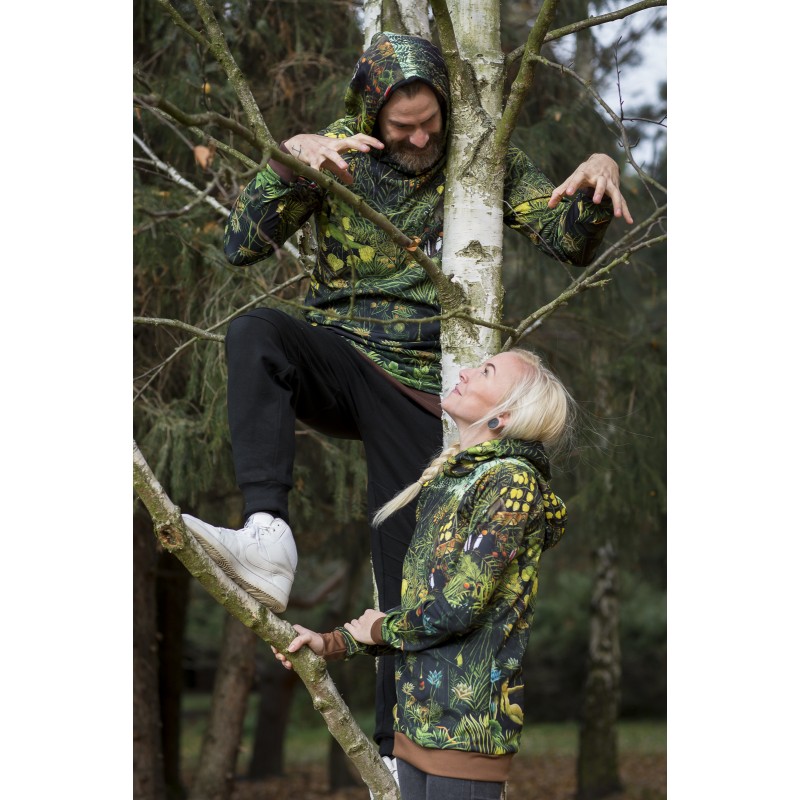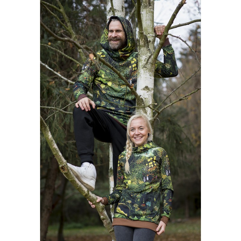 Mikinka je ušitá z celopološne potlačenej látky s hobitou kapuckou a patentami.